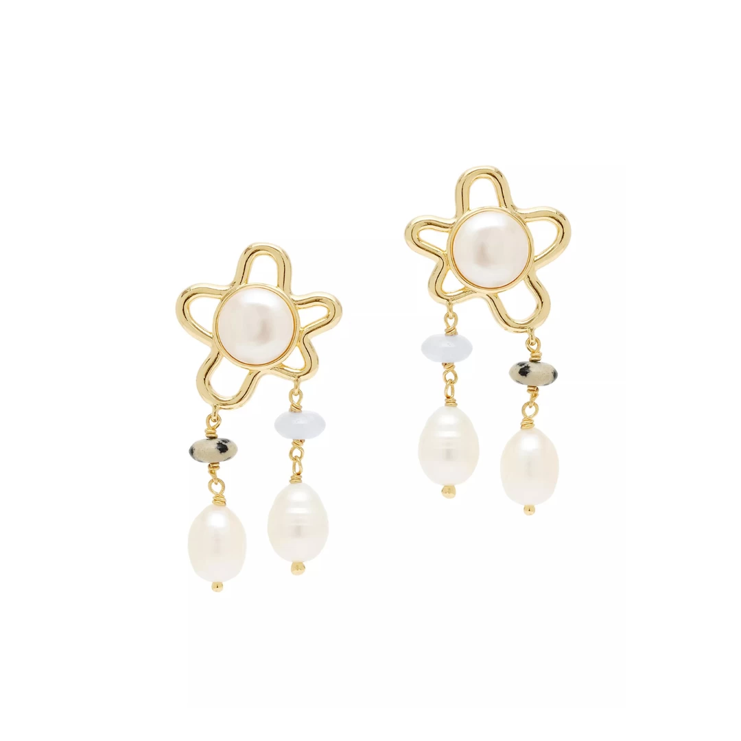 Mignonne Gavigan’s Bonnie flower drop earrings are handcrafted of 14K-gold-plated brass embellished with lustrous white freshwater pearls and vibrant beads.