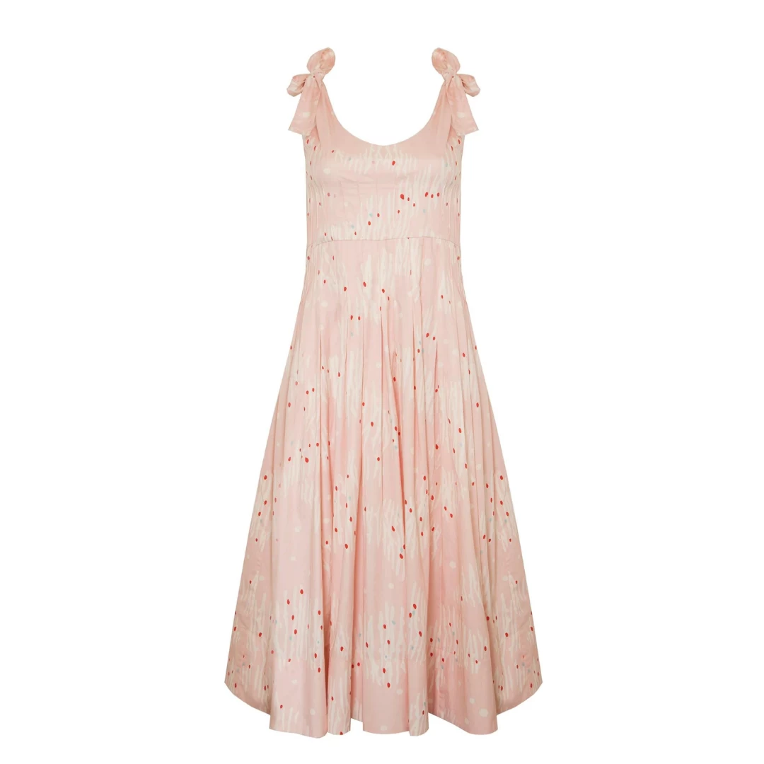 The Braden dress features a deep scoop neckline, fitted bodice, and beautiful waistline pintucks. Adjustable self-ties at the shoulders provide an extra element of fun to this already feminine fit and flare midi silhouette.