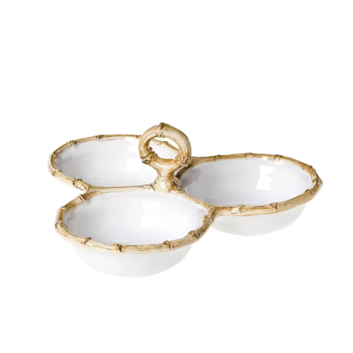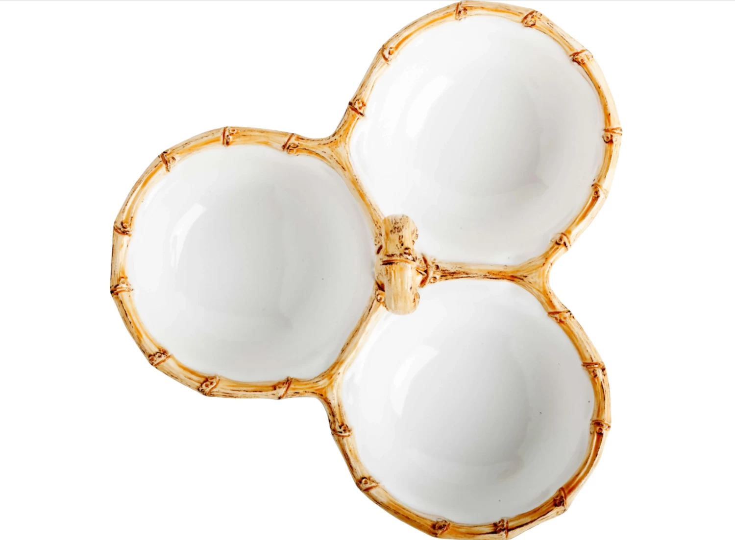 From our Classic Bamboo Collection- Add a splash of bohemian beauty to cocktail hour. Our bamboo-rimmed trio of ceramic serving bowls are united by a ring-shaped handle that makes transporting nibbles a breeze – from cocktail mixes on the veranda to homemade spiced nuts.