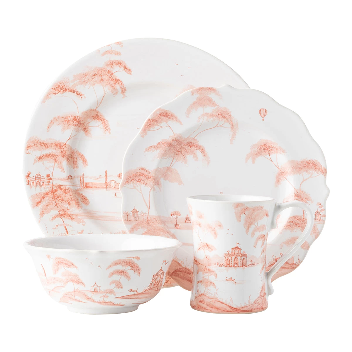 From our Country Estate Collection- Featuring narratives of the English Countryside, our 4 piece setting in petal pink contains a dinner plate, dessert/salad plate, cereal/ice cream bowl and mug.