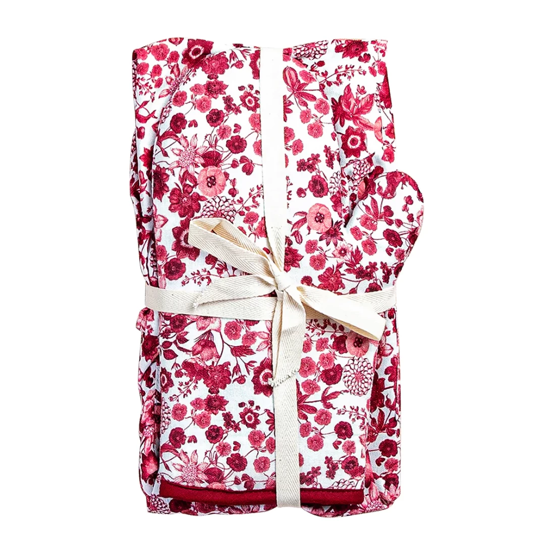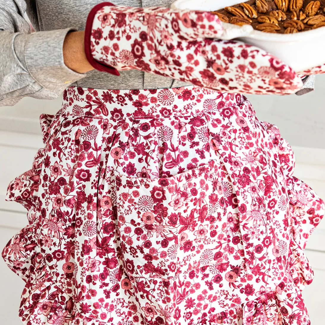 This apron of ruby-hued flowers is both relaxed and preppy, with a ruffled trim for a romantic finishing touch. A matching oven mitt completes the ensemble, taking you from the kitchen to your table to your guests, in timeless style.