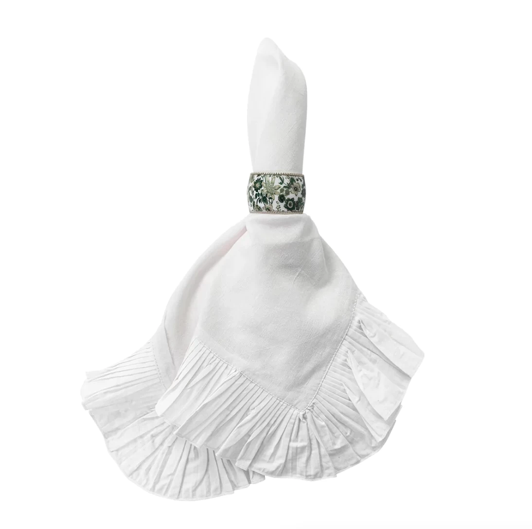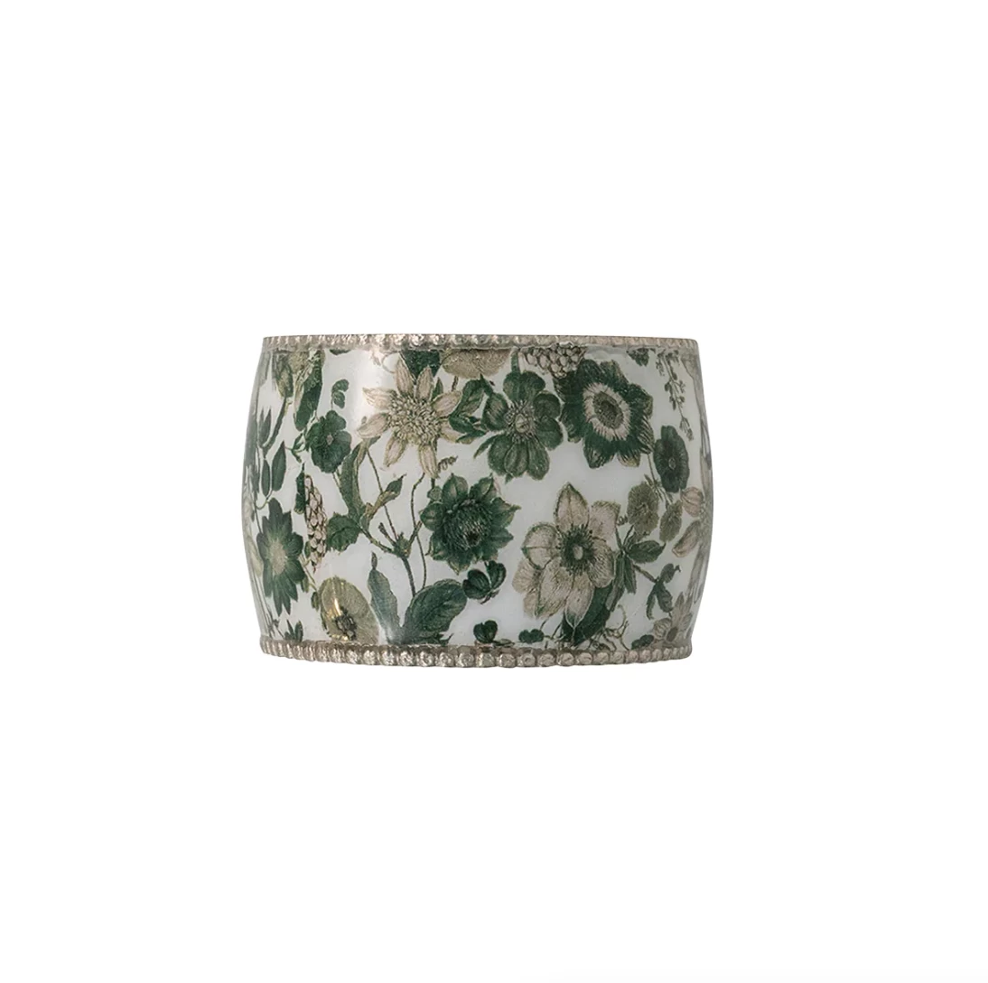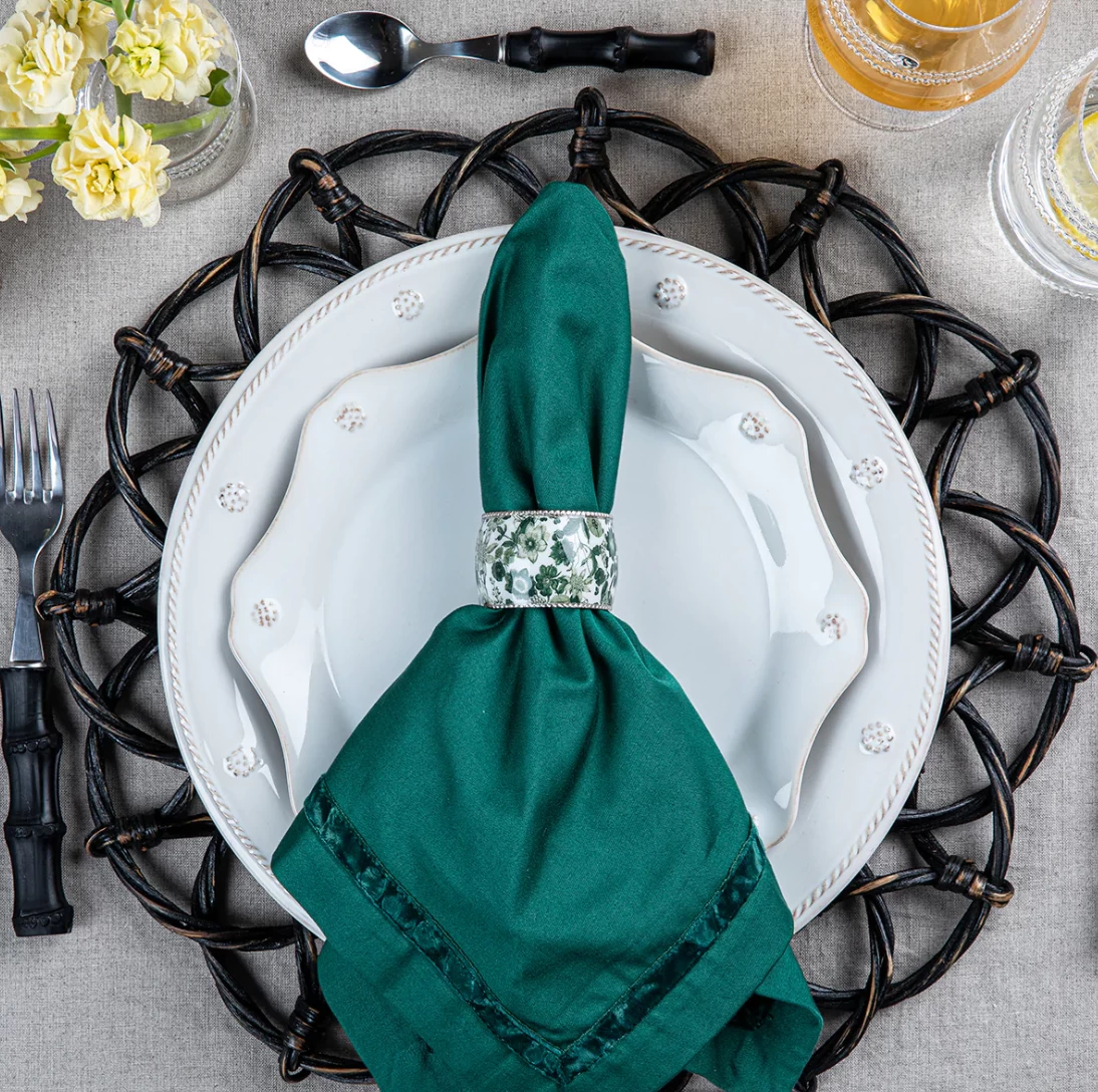 An accent of jewelry for the table, our enamel napkin rings are trimmed with a prim little aluminum braid and pull together table settings with a becoming floral finish that we think is just blooming brilliant!
