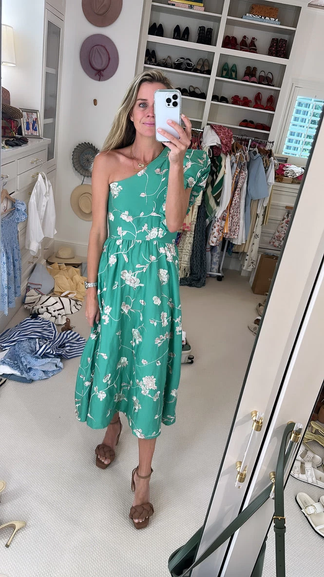 The Julian floral embroidered dress features a ruched puff sleeve and one shoulder neckline.