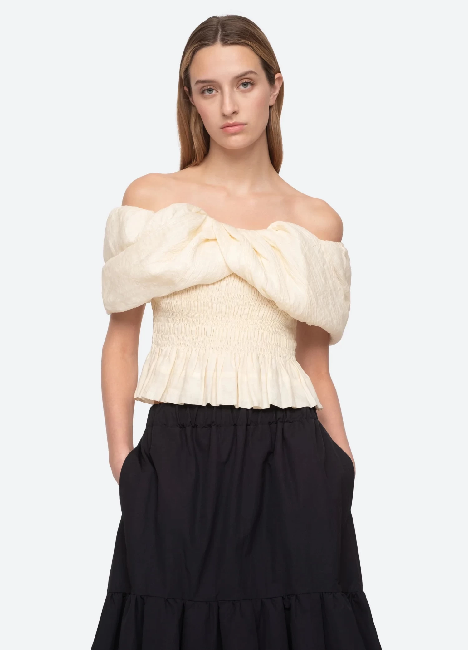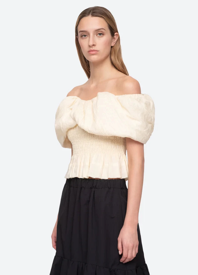 The Loren off the shoulder top features an oversized off the shoulder draped shawl with smocked bodice and ruffle hemline.
