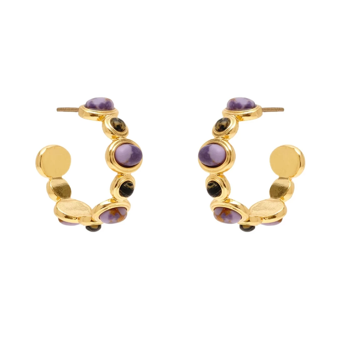 Pattern, material and sculpture were pertinent to our designing of fall ’23. These stone, gold hoops perfectly embody subtle nods to beautiful interiors and luxurious material. Style alongside our Cece charm necklace to complete your look.