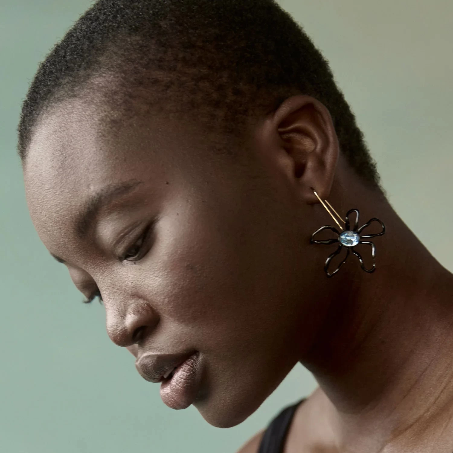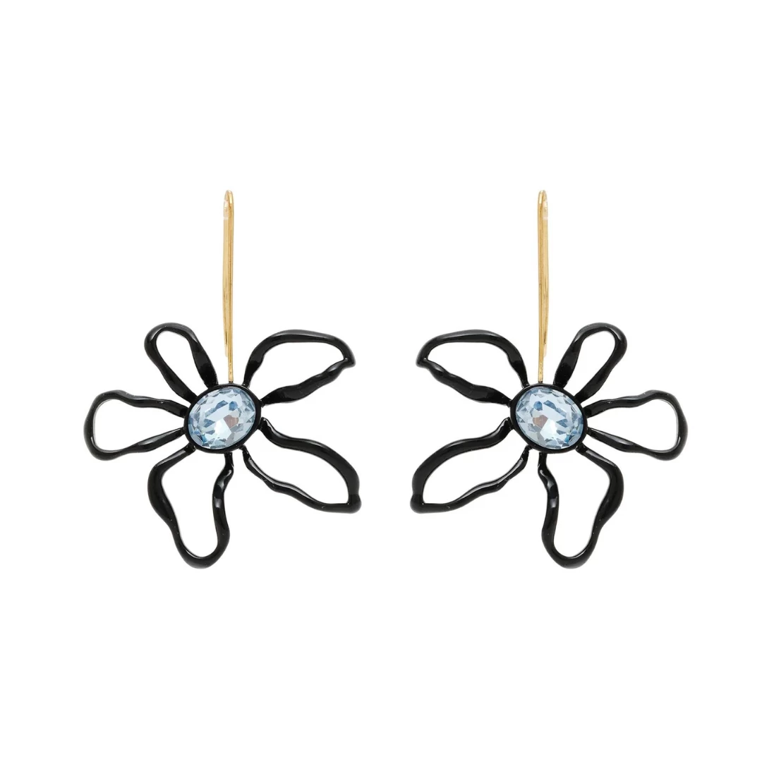 Dark sculptural florals finished with a fishhook drop that feature icy blue crystals.