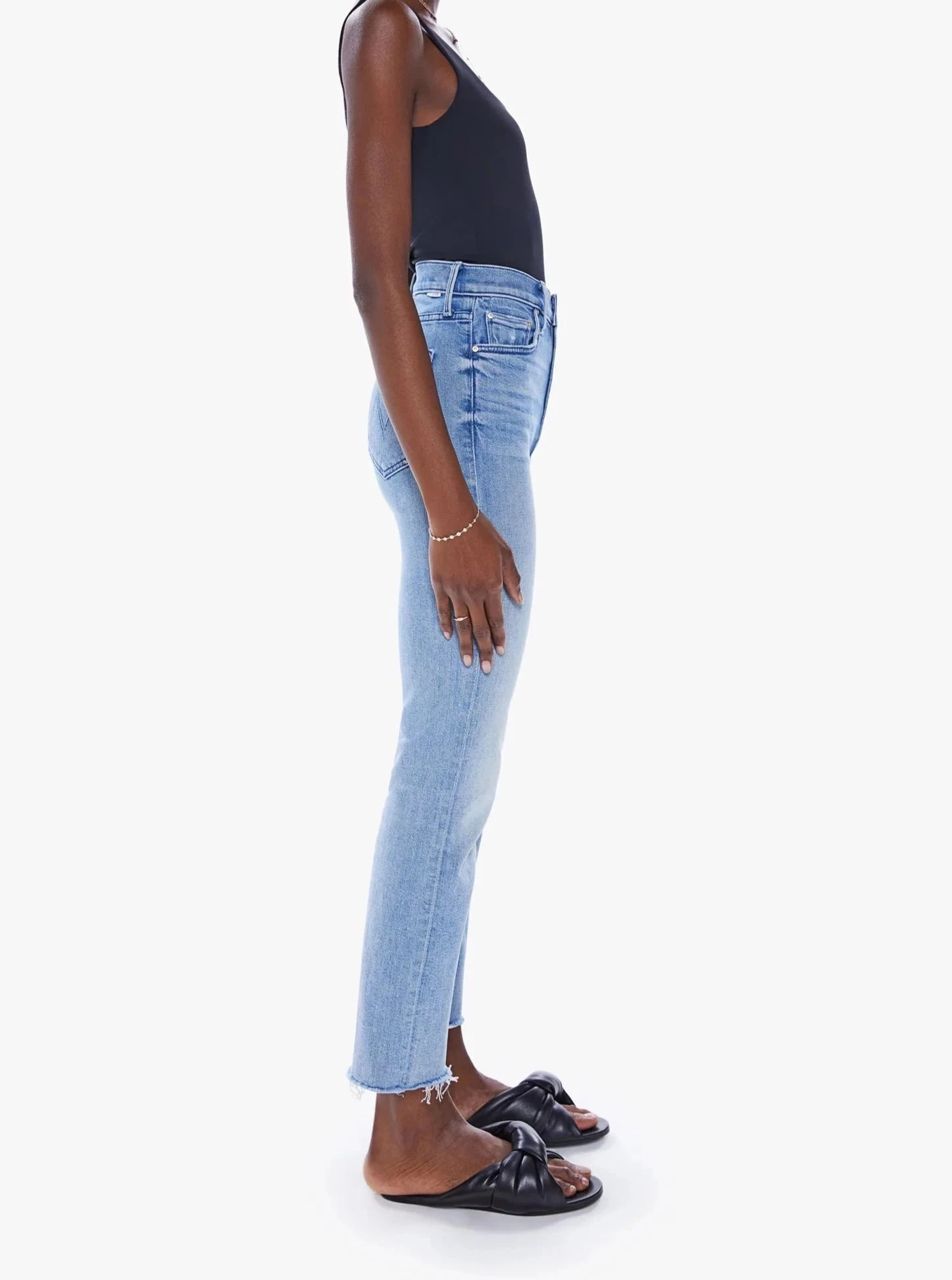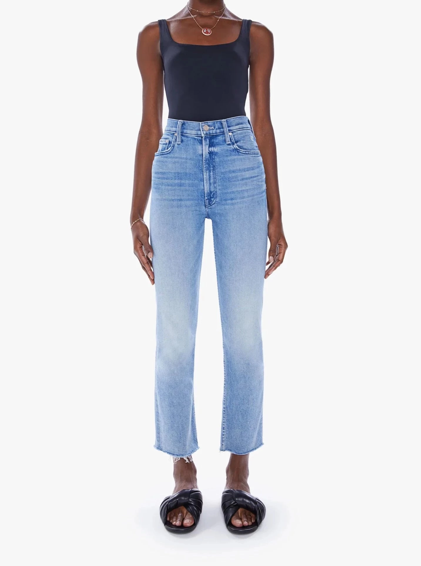 Mother Denim does it again. The perfect high-waisted straight leg with an ankle-length inseam and a frayed hem. Cut from comfortable stretch denim, Fish Out Of Water is a light blue wash with fading and whiskering.