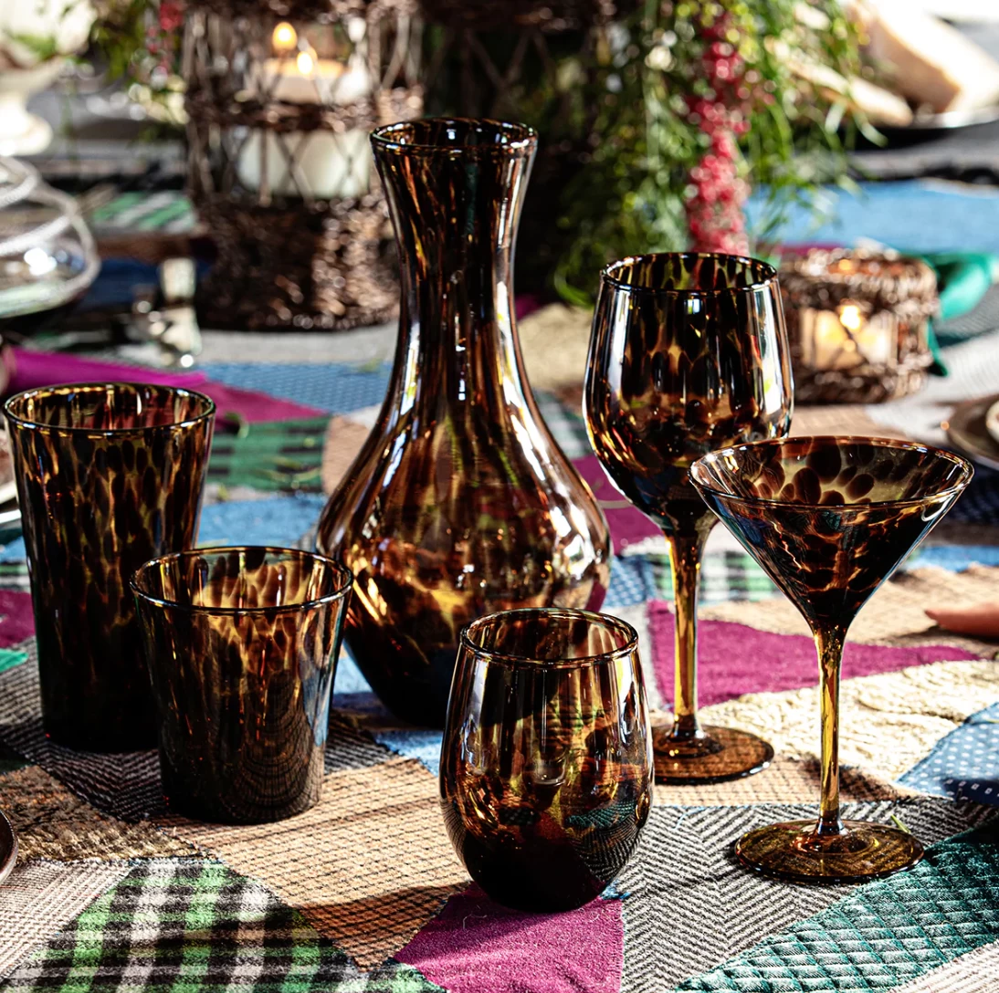 This richly hued tortoiseshell stemless wine glass, with translucent brown body and dark specks, with handsomely hold a variety of beverages from hand-crafted cocktails to craft beers.