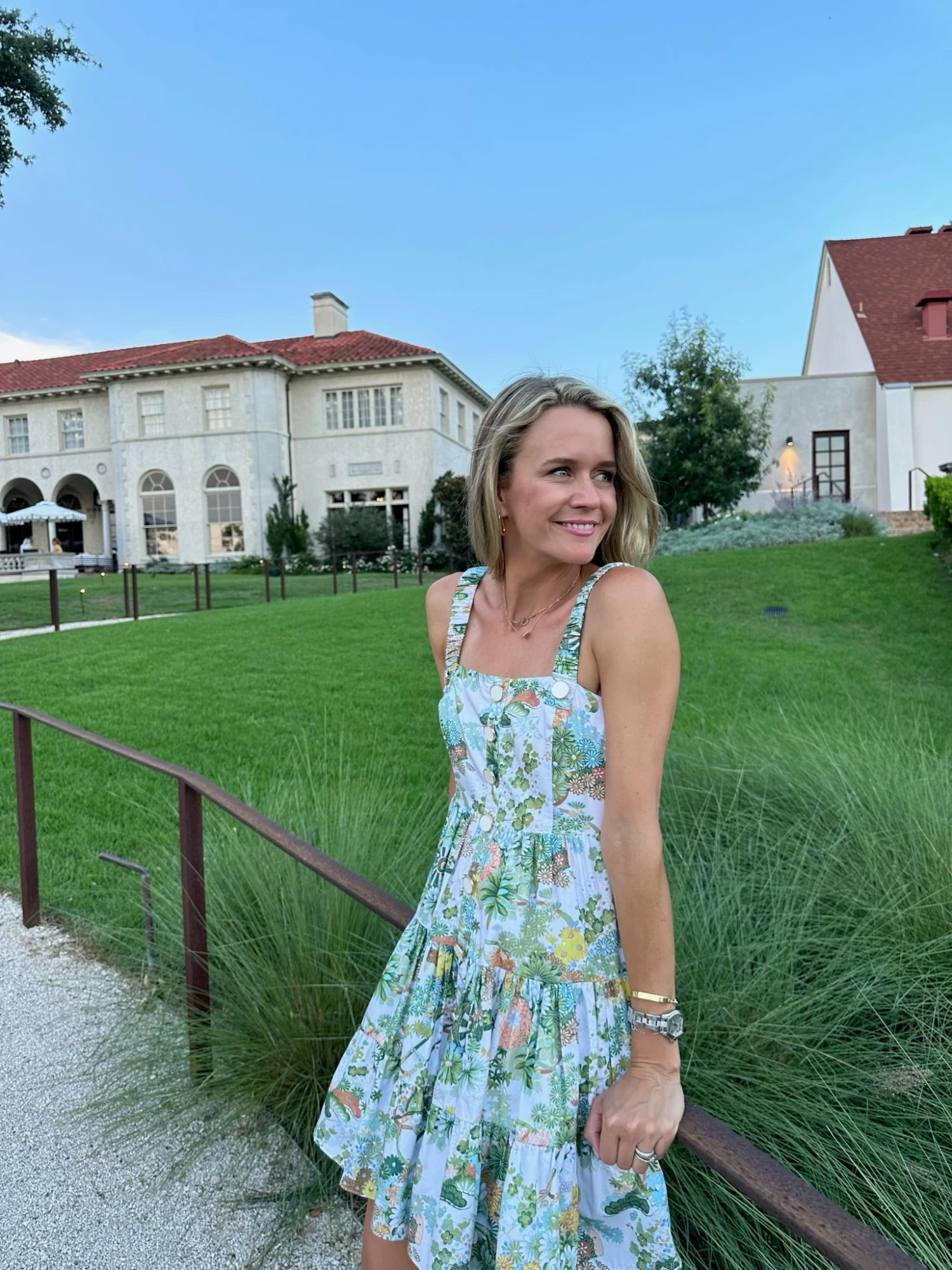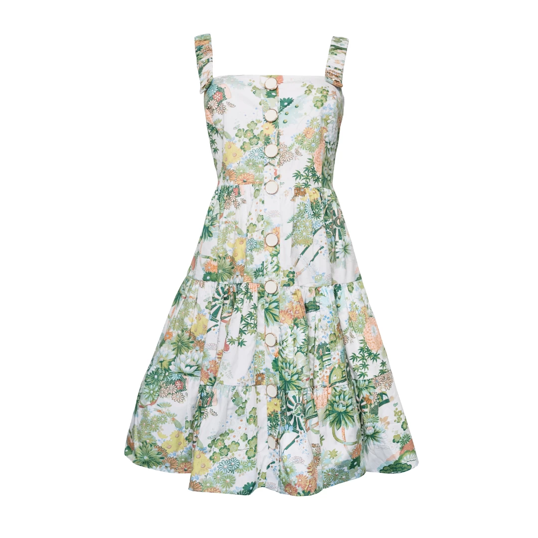 The Tiered Button Detail Dress features enamel buttons, ruched straps, and a short, tiered silhouette.
