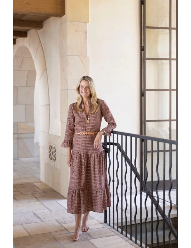 Designed to seamlessly work into your wardrobe for the in-between seasons of summer and fall, our lattice print will by your style stalwart for September and beyond. The unexpected color combination of warm pink and rich chocolate marries beautifully on this geometric design, a welcome departure from florals. In different scales for contrast, the pieces are designed to be worn together or paired with your go-to lightweight cardigan, slouchy denim or silver flats. This blouse is the perfect weight for now with the final days of linen shorts season and later with a dark denim maxi skirt, layered under a knit and with boots. This tiered dress is designed for a one-and-done outfit solution come the busy fall and back-to-school days ahead.