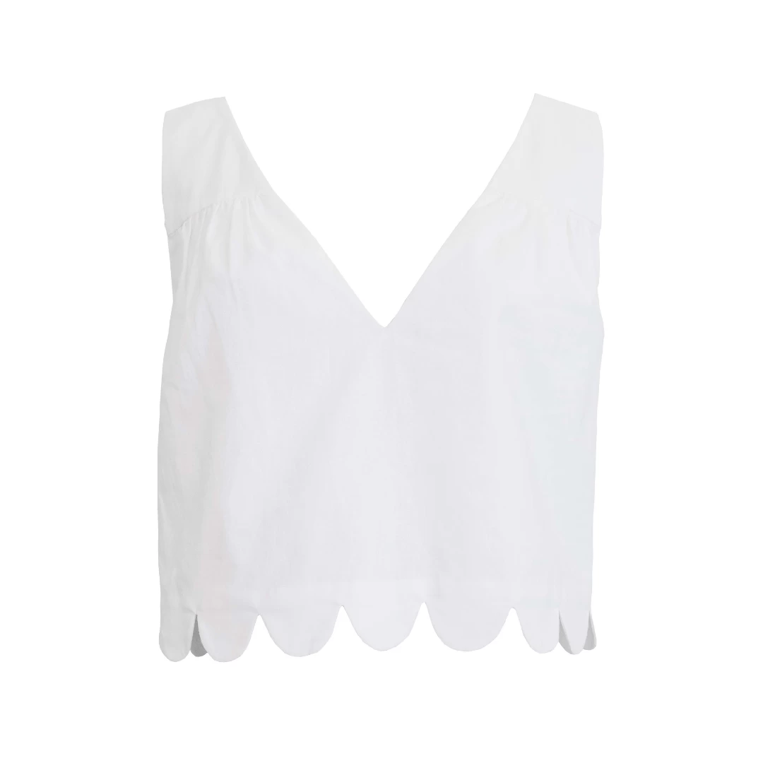 The V-Neck Scallop Detail Tank features a v-neck silhouette and a scallop edge hem detail.
