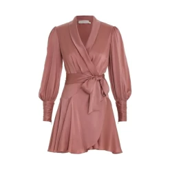 The Silk Wrap Mini Dress in Dusty Pink from the Fall 2023 Collection, Luminosity. A silk mini dress featuring a wrap front silhouette, blouson sleeves and flounce skirt.